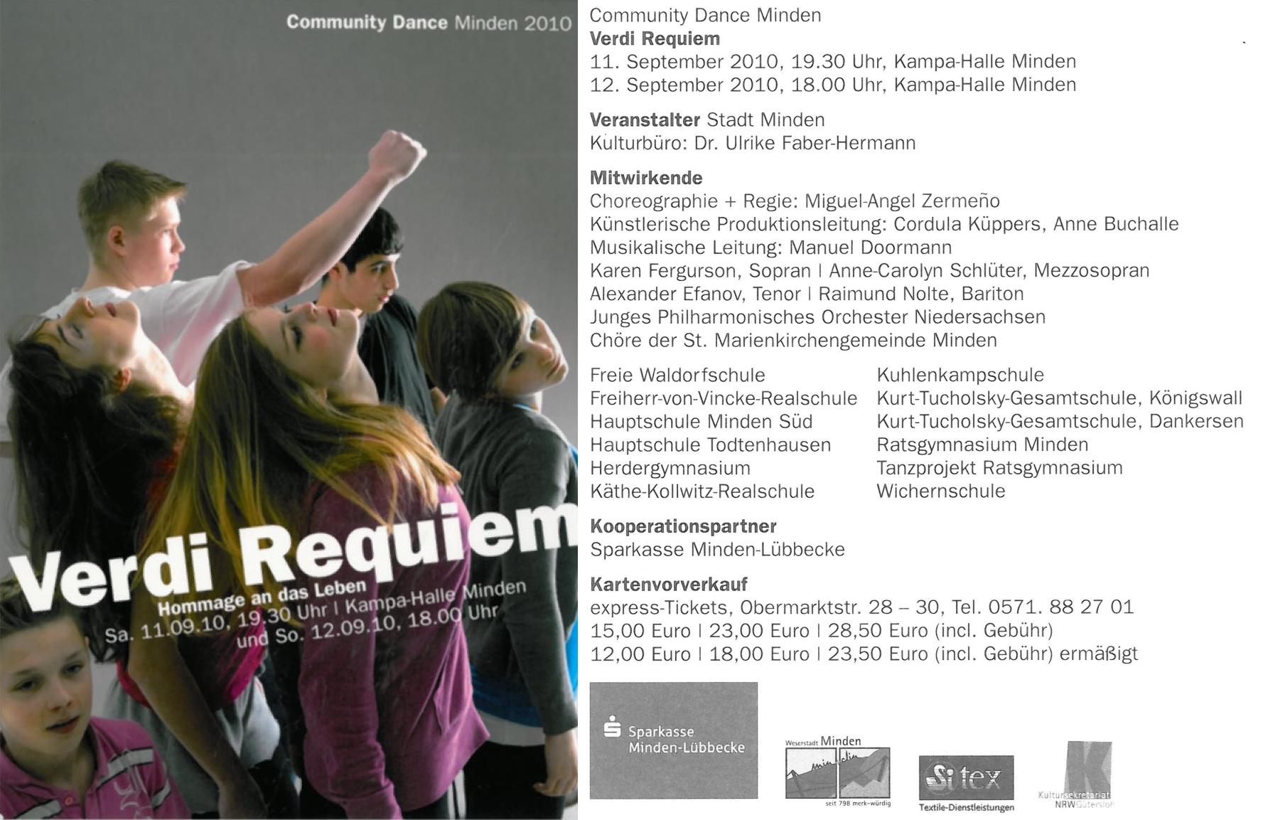 | September 2010 | 12 So | 18.00Uhr, Kampa-Halle Minden, Verdi Requiem - Hommage an das Leben, aufgeführt vom Community Dance Minden <Plakat> Kartenvorverkauf: express-Tickets, Obermarktstr. 28-30, Tel 0571-882701 |