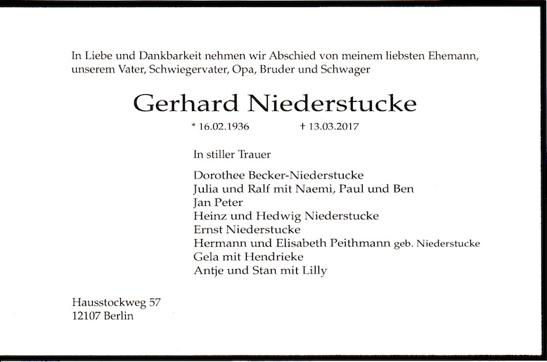 Gerhard Niederstucke (* 16.2.1936) ist am 13.3.2017 nach längerer Krankheit verstorben. Er wurde 81 Jahre alt.