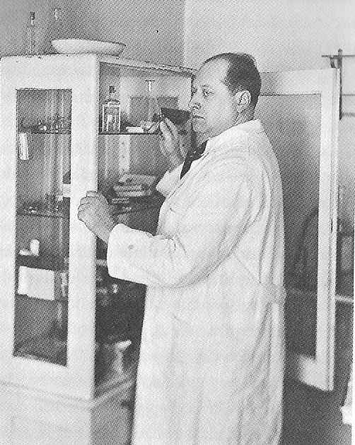 Auf dem Bild, aufgenommen 1933, ist Benn zu sehen als Arzt in seiner Praxis an einem Schrank mit Utensilien. Er wirkt etwas abwesend.