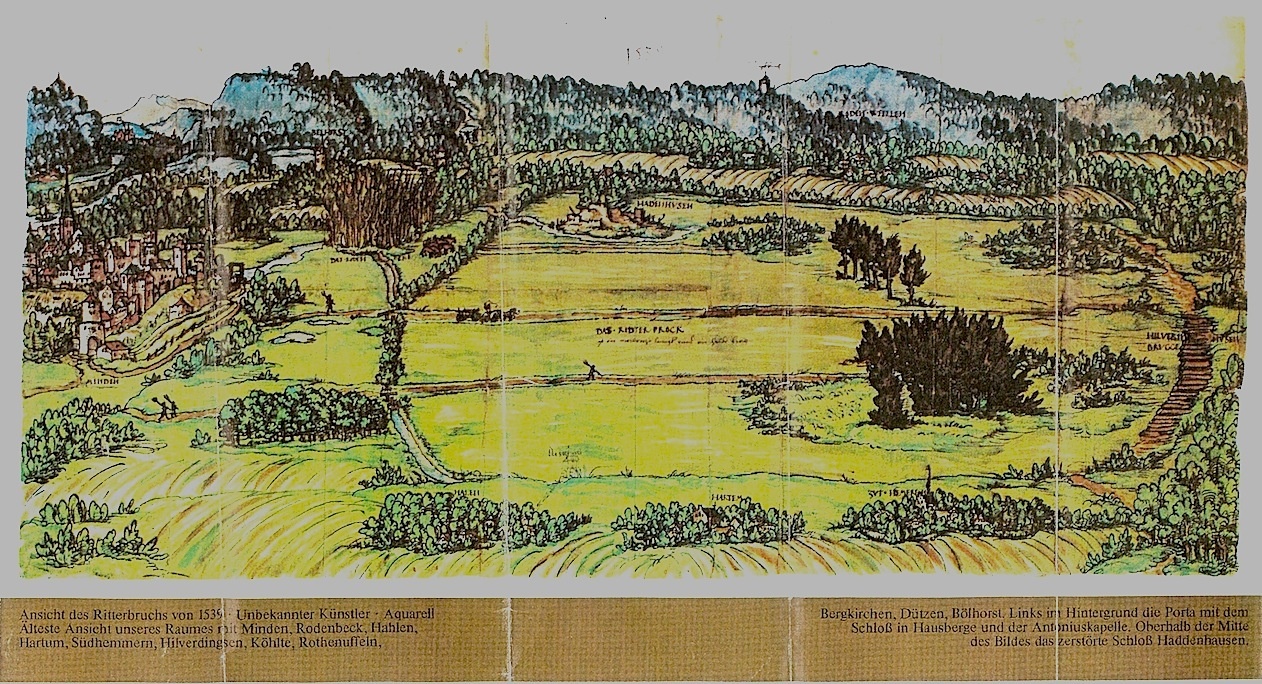 Neues historische Bilder können wir hier publizieren: Es handelt sich um z.B. eine Aquarell-Darstellung aus dem Jahre 1539, also 9 Jahre nach der Gründung unserer Schule, und zeigt eine Ansicht der Stadt sowie den „Ritterbruch“ mit einer Darstellung der Porta Westfalica, natürlich ohne Denkmal. Andere Bilder zeigen z.B. die Dampfstrassenbahn, die durch die „Elektrische“ abgelöst wurde.