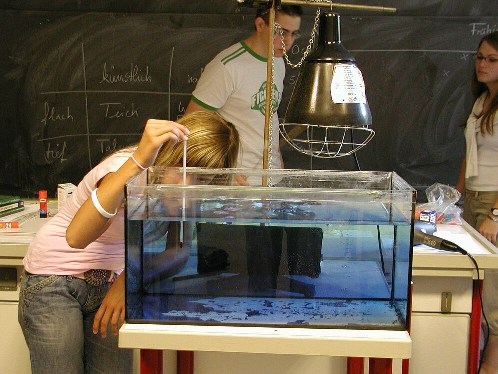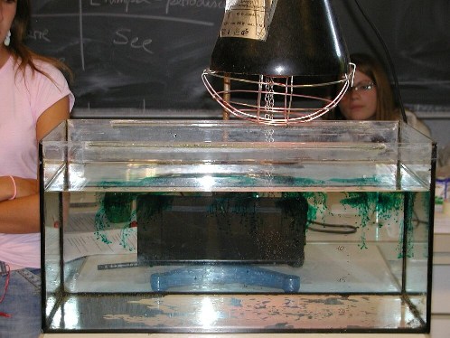 Wir haben bei einem Aquarium ca. 20 min unter einer Wärmelampe (Sonne) gestellt. Erneut wurde die Temperatur gemessen. Danach wurde grüne Tinte in gleichmäßigen Abständen in das Wasser pipettiert.